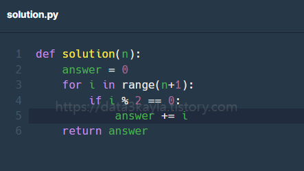 1부터 n까지의 정수를 입력받아야 하기 때문에 'for i in range(n+1)'문을 입력한 뒤 정수 i를 2로 나눈 나머지가 0일 경우(짝수)에 answer에 해당 i값을 더하여 최종answer 값을 출력한다.