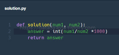 정수 num1과 num2가 매개변수로 주어질 때, num1을 num2로 나눈 값에 1,000을 곱한 후 정수 부분을 return 하도록 soltuion 함수를 완성해주세요.
